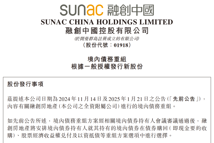 就在其境内债重组成功3个月后,融创中国再次宣布对其境外债进行二次重组,全额债转股成为最大亮点。根据融创中国最新公告,截至6月30日,重组支持协议中的现有债务未偿还本金总额约75%的持有人已加入重组支持协议,境外债有关计划的聆讯定于2025年9月15日上午10时在香港高等法院举行。叠加境内债重组的化债影响,融创中国预计将整体压降近700亿元债务。