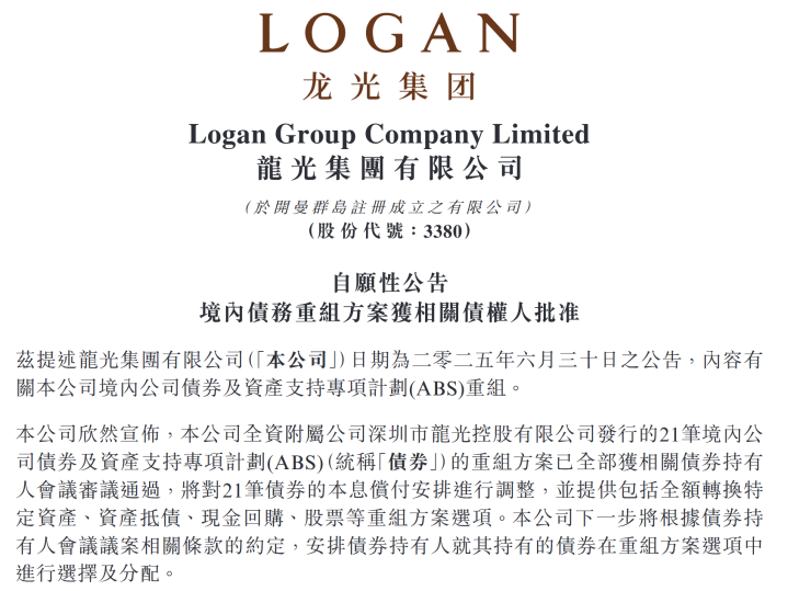 7月10日,龙光集团公告宣布,公司全资附属公司深圳市龙光控股有限公司境内债券重组已完成投票,涉及的21笔公司债券及资产支持证券重组议案均获得投资人表决通过,涉及本金余额合计219.6亿元,涵盖公司债券及资产支持证券等各类债券品种。