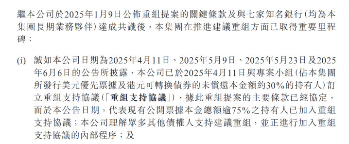 6月30日,碧桂园公告称,截至公告日,代表现有公开票据本金总额逾75%的持有人已加入境外债重组支持协议,公司将继续与主要债权人磋商重组条款,以尽快达成协议并于2025年底前实施建议重组。